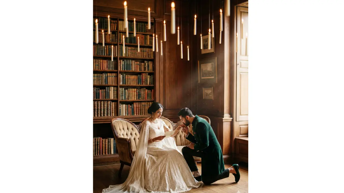 Romantic royal library in 300-year-old palace, floor-to-ceiling ancient books, hundreds of floating real candles. Bride in ivory Victorian-inspired lehenga with dramatic cape sleeves, seated on antique chair reading love letter. Groom kneeling, gently kissing her hand. Warm candle bokeh, dust particles in air beams, rich mahogany tones, Rembrandt lighting, timeless luxury –ar 3:4 –stylize 600