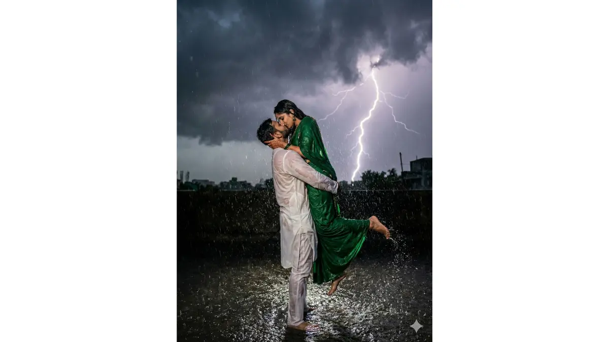 Raw dramatic monsoon rain with real lightning flashes every few seconds. Bride in soaked emerald-green saree clinging to body, groom in white kurta turning transparent. Iconic Bollywood lift in pouring rain, lightning illuminating their intense kiss, high-contrast black clouds, water splashing, pure passion and drama –ar 3:4 –stylize 800